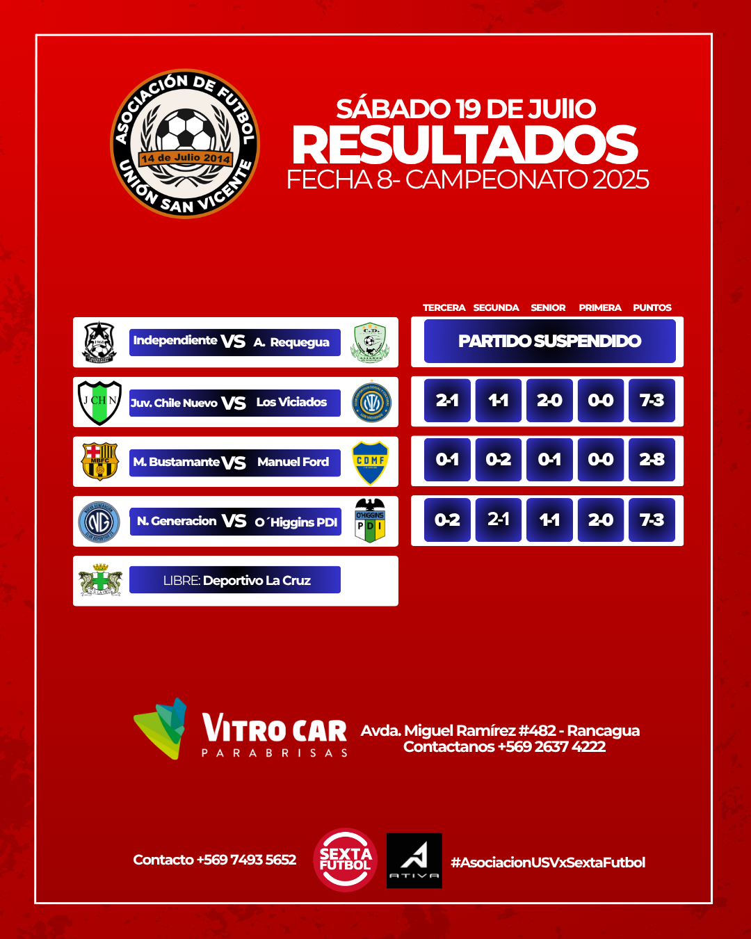 Este pasado sábado se disputó la octava fecha del Campeonato Asociado Unión San Vicente 2025. Estamos llegando al término de la primera rueda y cada punto cuenta en una tabla de posiciones que se encuentra apretadísima en la parte alta. Te invitamos a leer el resumen de la fecha.