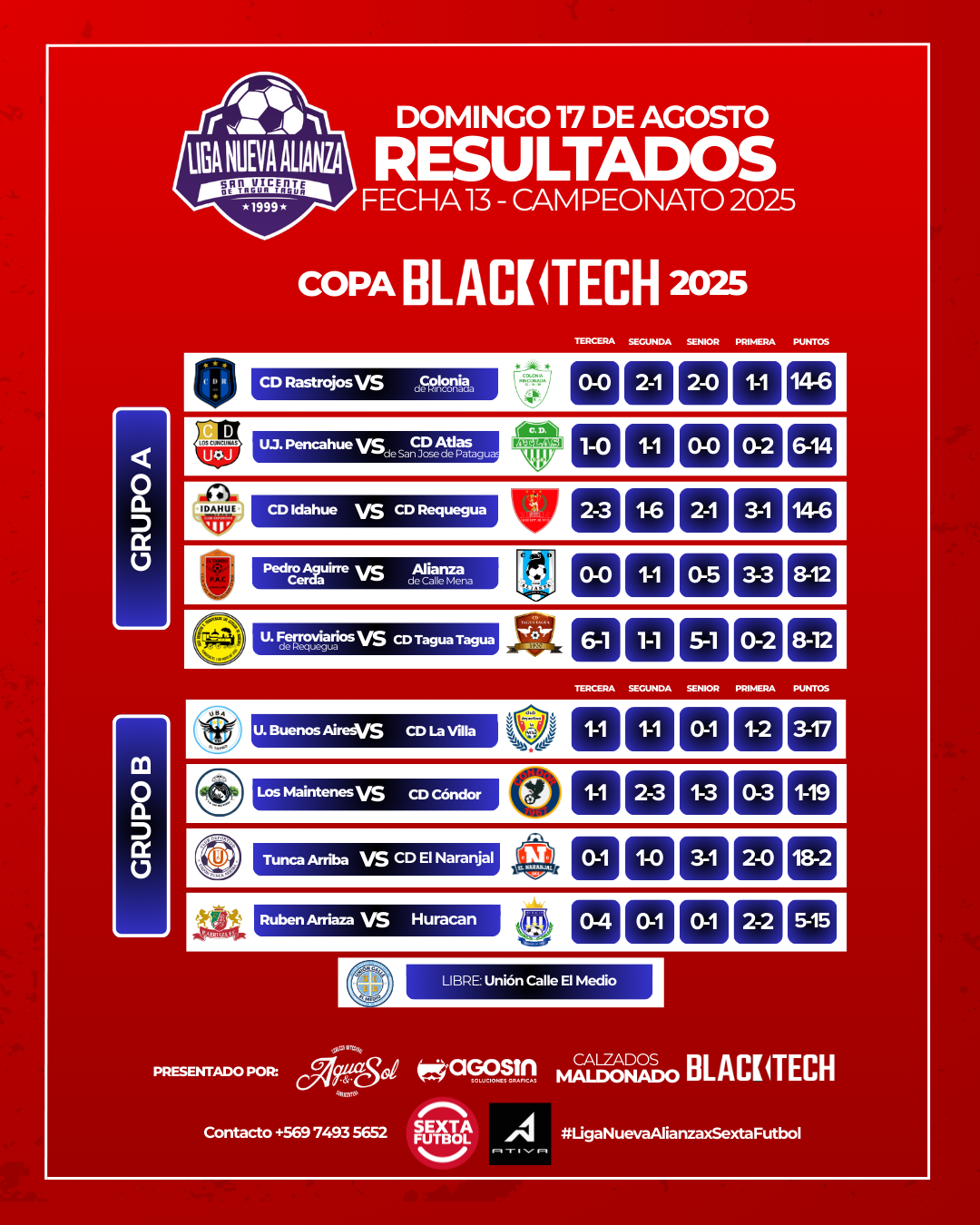 La décimo tercera fecha de la Liga Nueva Alianza 2025 se desarrolló en completa normalidad en los nueve campos deportivos donde se disputaron los encuentros de la Copa Blacktech, entregando resultados que mantienen la emoción en ambos grupos.