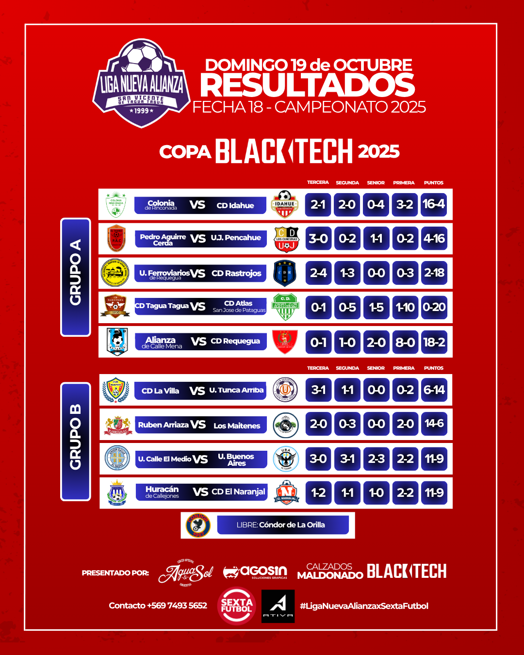 CD Rastrojos es otro de los clubes que dirán presente en Playoffs tras superar como forastero a Unión Ferroviarios de los Altillos de Requegua. El Bi-campeón de la Liga Nueva Alianza, Atlas de San José de Pataguas superó sin problemas a CD Tagua Tagua sumando 20 puntos. Por último, Alianza de Calle Mena en casa concretó su clasificación como puntero al superar a Deportivo Requegua.