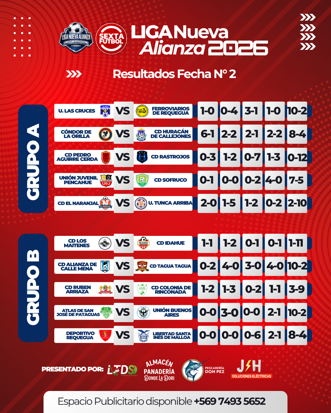 Por su parte, en el Grupo B, CD Idahue sigue consolidando su buen inicio y se posiciona como líder tras obtener 11 puntos en su visita a Los Maitenes. En Calle Mena, Alianza sumó 10 unidades al imponerse sobre Tagua Tagua, que consiguió sus primeros dos puntos del torneo.